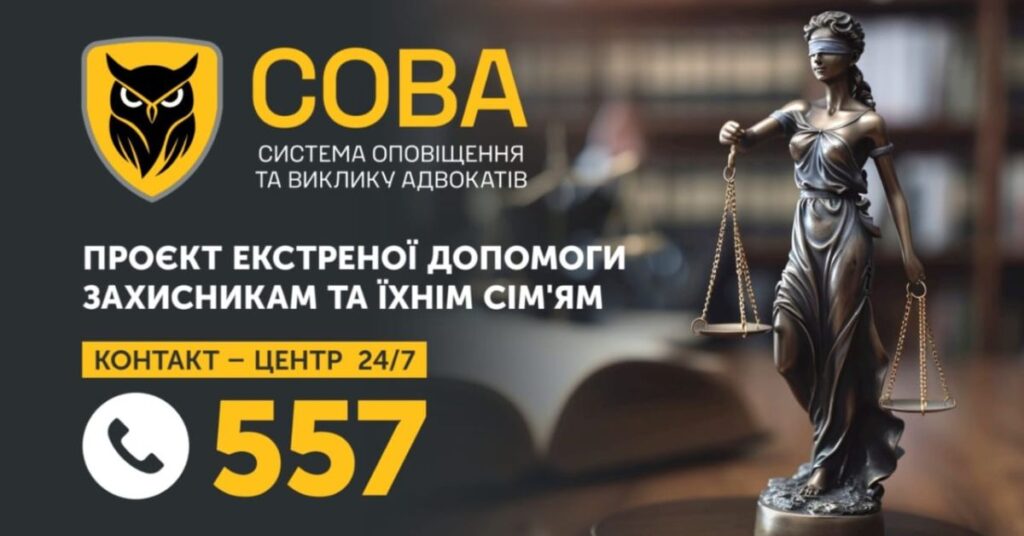 Проект «СОВА» безкоштовно забезпечує первинну юридичну допомогу захисникам та членам їхніх сімей із екстреним виїздом адвоката на місце надзвичайної ситуації.