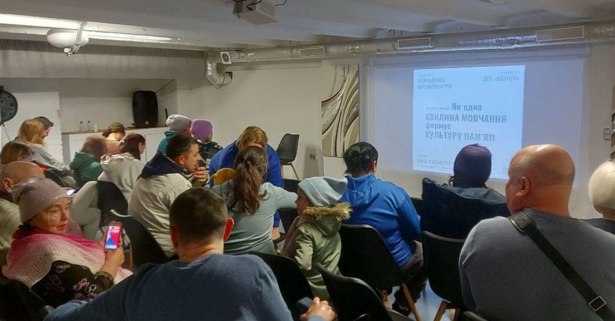 Дніпро. 16 грудня відбулася відкрита лекція на тему: «Як одна хвилина мовчання формує культуру пам’яті за загиблими військовими та цивільними». Організатором заходу став Громадсько-військовий рух, запросивши у якості спікера Анну Матвієнко, координаторку у місті Дніпро ВГО «Вшануй».